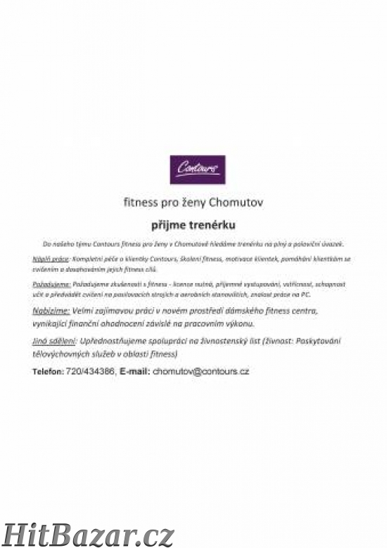 Fitness pro ženy Chomutov přijme trenérku. Do našeho týmu Contours fitness pro ženy v Chomutově hledáme trenérku na plný a poloviční úvazek. Náplň práce: Kompletní péče o klientky Contours, školení fitness, motivace klientek, pomáhání klientkám se cvičením a dosahováním jejich fitness cílů. Požadujeme: Požadujeme zkušenosti s fitness - licence nutná, příjemné vystupování, vstřícnost, schopnost učit a předvádět cvičení na posilovacích strojích a aerobních stanovištích, znalost práce na PC. Nabízíme: Velmi zajímavou práci v novém prostředí dámského fitness centra, vynikající finanční ohodnocení závislé na pracovním výkonu. Jiná sdělení: Upřednostňujeme spolupráci na živnostenský list (živnost: Poskytování tělovýchovných služeb v oblasti fitness) Telefon: 720/434386, E-mail: chomutov@contours.cz