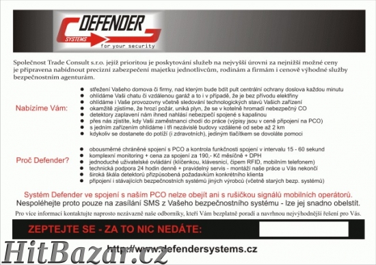 Trade Consult s.r.o. nabízí elektronické zabezpečení budov zařízením vlastní konstrukce Defender pro všechny typy objektů - velké firemní areály, střední i drobné podniky, školy a státní instituce, vily, rodinné domy, chaty a chalupy, garáže a všechny typy objektů i bez přívodu elektrické energie. Drátová i bezdrátová verze, velké množství čidel a indikátorů - IR a MW vnitřní i venkovní detektory pohybu, detektory tříštěného skla, zaplavení, detektory plynů, kouřová a požární čidla, magnetické kontakty, kamerové systémy, elektronické IR a MW brány atd. Dosah čidel ve volném prostoru je až 2 km od ústředny. Ovládání klávesnicí, klíčenkou, čipem RFID nebo mobilním telefonem. Všechny ústředny komunikují s naším vlastním pultem centrální ochrany (PCO) každých 15- 60 sekund. Díky této technologii nelze naše systémy obejít ani s rušičkou signálu mobilních operátorů. Cena za služby PCO je 230,- Kč/měsíčně. Připojíme i stávající systémy jiných výrobců. http://www.defendersystems.cz